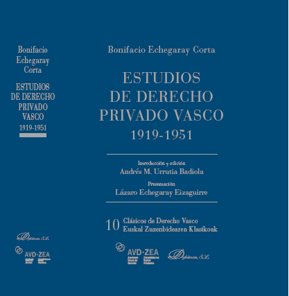 En este tomo se reunen una serie de trabajos publicados a lo largo de su vida por el jurista vasco Bonifacio Echegaray Corta (1878-1956). Echegaray, además de secretario de Sala del Tribunal Supremo, fue un activo partícipe de las diferentes instituciones culturales de Euskal Herria y ocupó cargos de responsabilidad en el Gobierno Vasco (1936-1937). Su completa visión del Derecho Civil Vasco, incluye la investigación de la costumbre como fuente del Derecho civil vasco y la utilización del euskera como medio de expresión de lo jurídico, lo que le convierte en un autor indispensable a la hora de analizar la historia y la aplicación del Derecho Civil Vasco en la primera mitad del siglo XX. El libro contiene una presentación de Lázaro Echegaray, familiar de Bonifacio Echegaray y un estudio introductorio de Andres Maria Urrutia Badiola, presidente de la Academia Vasca de Derecho y responsable de la edición.